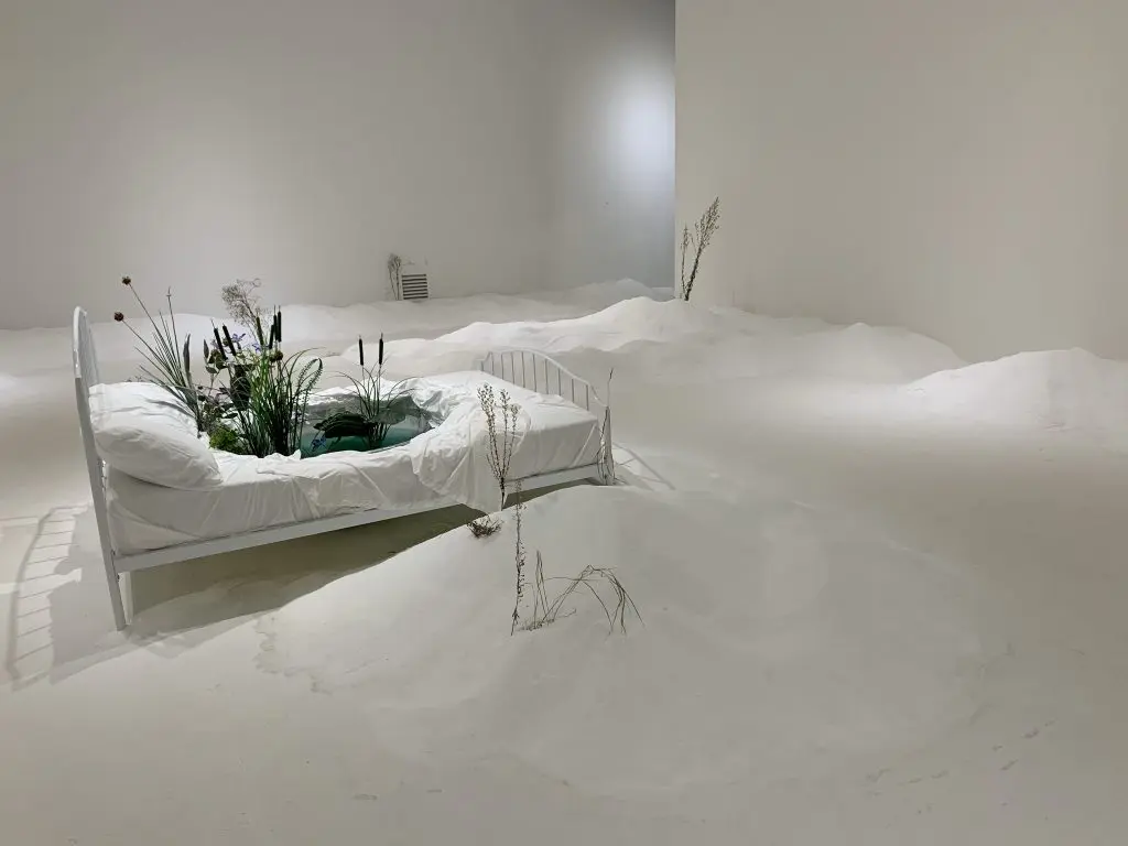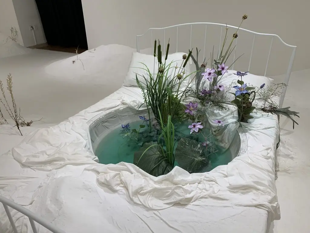 벽에 걸린 회화 작품들 속 불꽃은 동학농민운동의 열정을 상징하며, 바닥에 넓게 깔린 광목천 위 사발통문을 모티브로 한 글귀와 규칙 없이 나열된 요강, 흙, 쇳가루들은 동학농민혁명 중 죽어간 민초들의 고난과 삶을 대변한다.