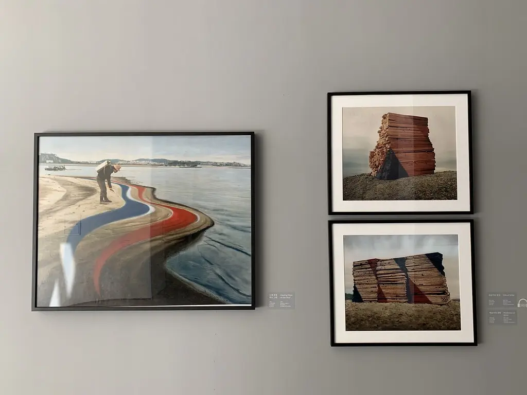 <모래 위에 파도그림>은 작가가 바다에서 진행했던 퍼포먼스를 촬영한 사진에 푸른색과 붉은색을 활용해 그림을 그린 사진-회화 작품이다