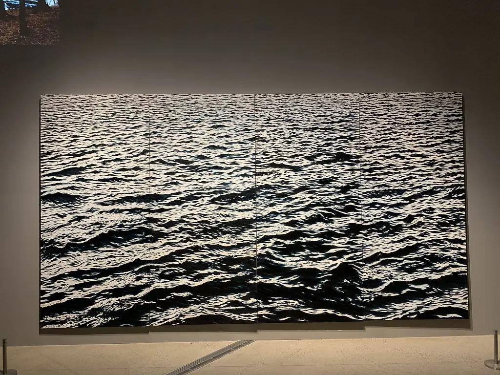 바다를 표현한 회화작품인 <산정의 바다는> 작품의 이름처럼 파도의 이미지를 그린 후, 작가가 작품을 들고 산 정상에 올라가 작품을 완성시켰다.