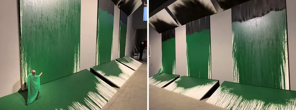 <녹의 수난>은 녹색 페인트 만으로 제작되었지만 작품을 불에 태워 생기는 그을음으로 작품 상단 검은색 부분을 완성하였다.